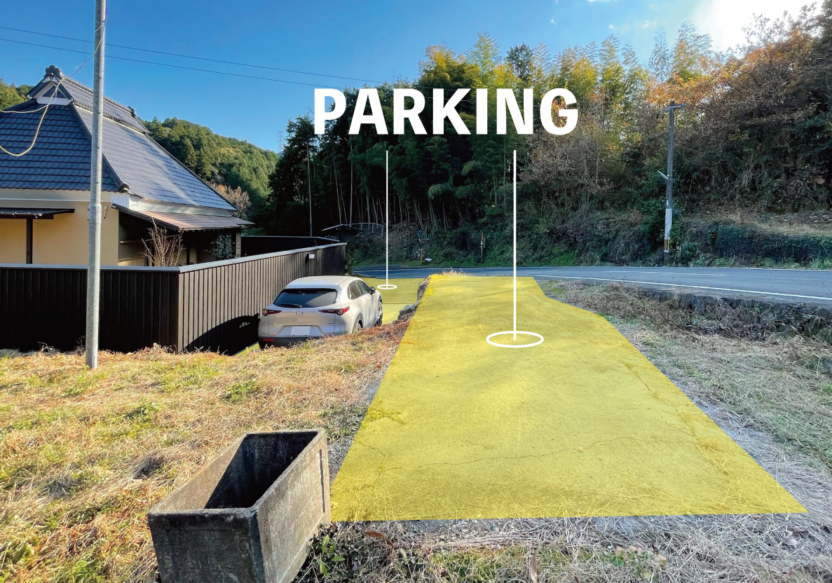 駐車場は門の前に2〜3台程度、その一段上に2台程度駐車が可能です。出入り口には段差があります。